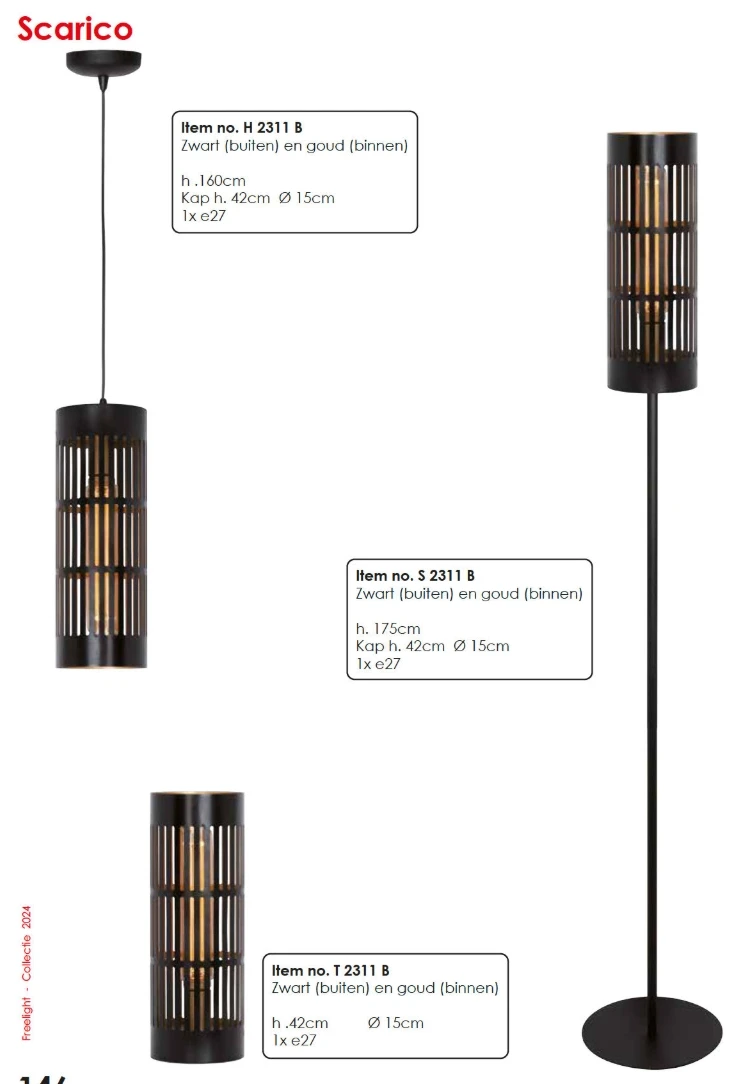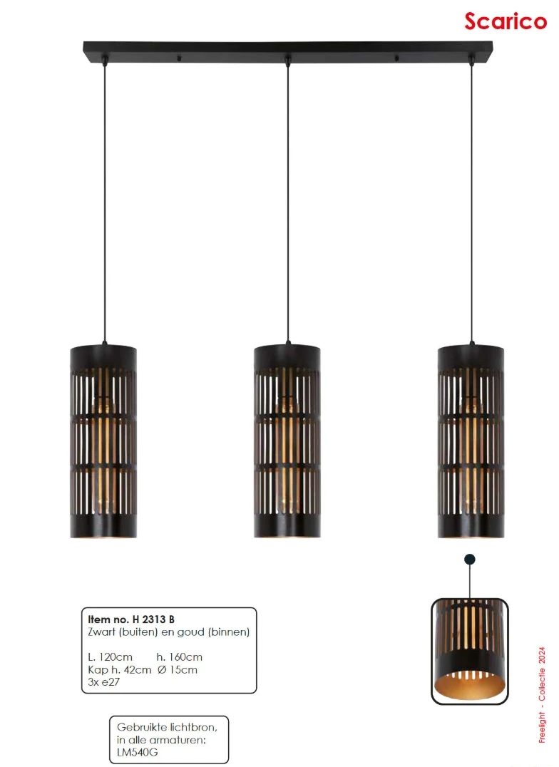De Scarico is ontwikkeld door het merk Freelight. Het artikelnummer van deze prachtige hanglamp is H2313B. De lamp past met haar gouden kleur perfect in een . De hanglamp Scarico is uitgevoerd met een E27-fitting(en) en wordt geleverd zonder lichtbron. De lamp heeft 3 lichtpunt(en). .