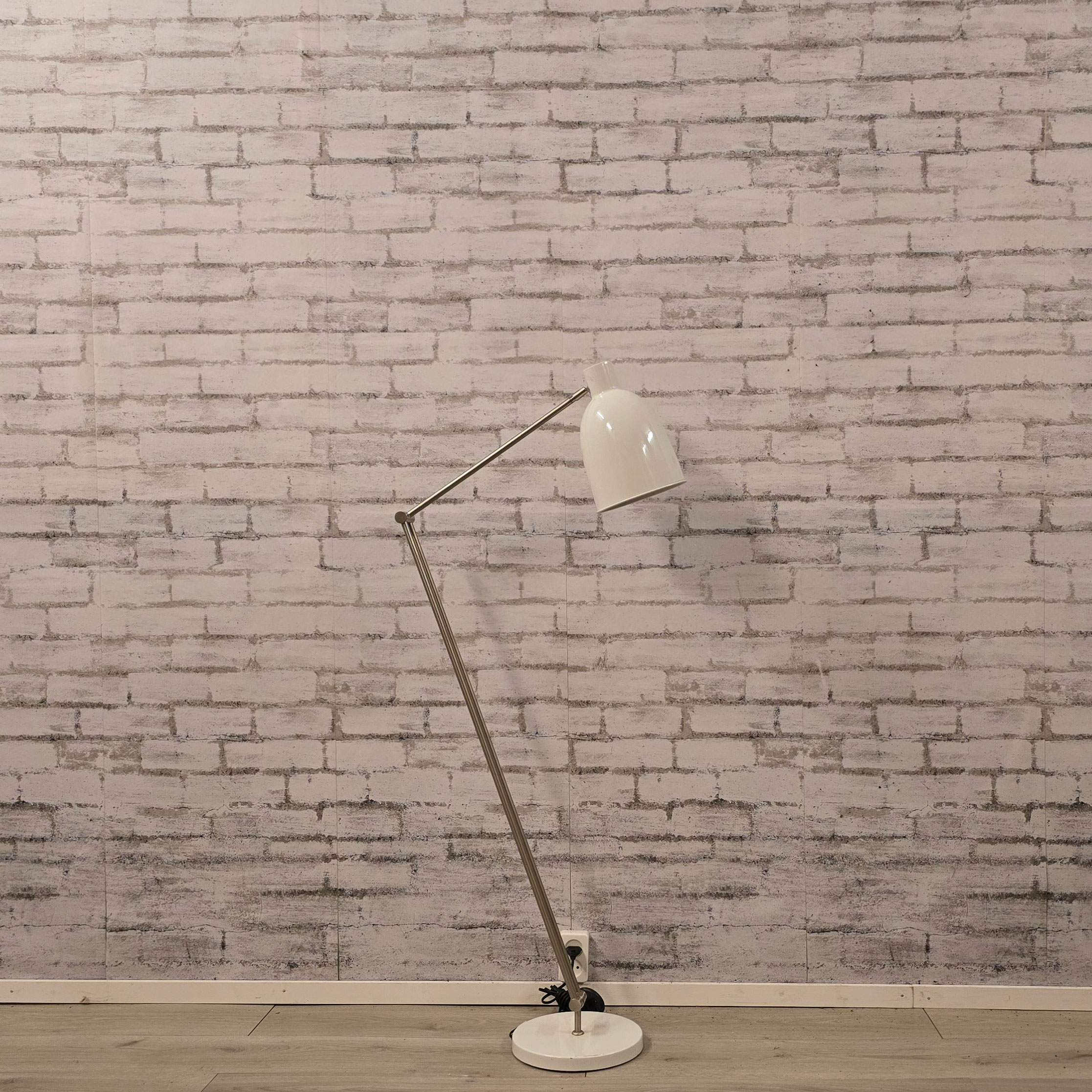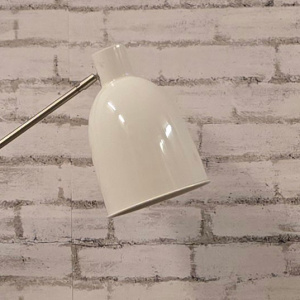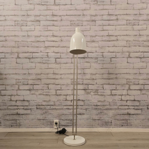 Stoere leeslamp in RvS en crème kap en voet, verstelbare arm, geschikt voor LED lichtbronnen met een dikke fitting.