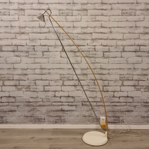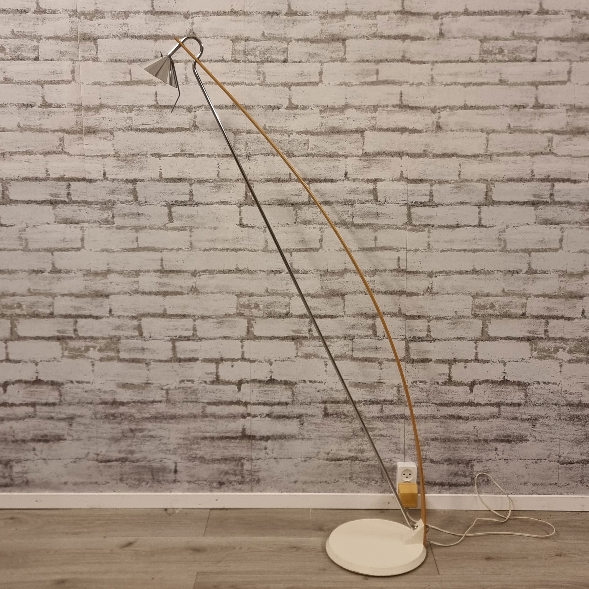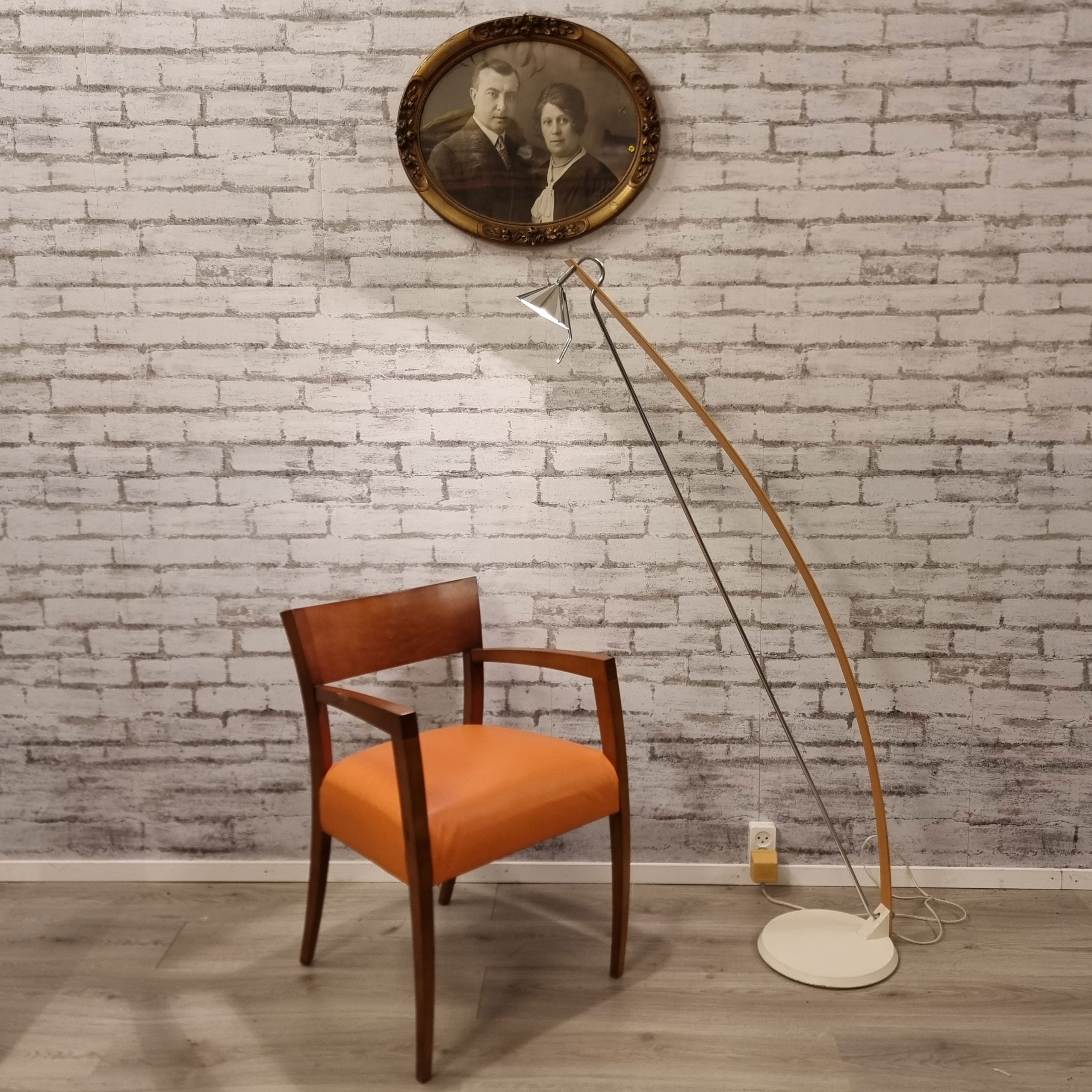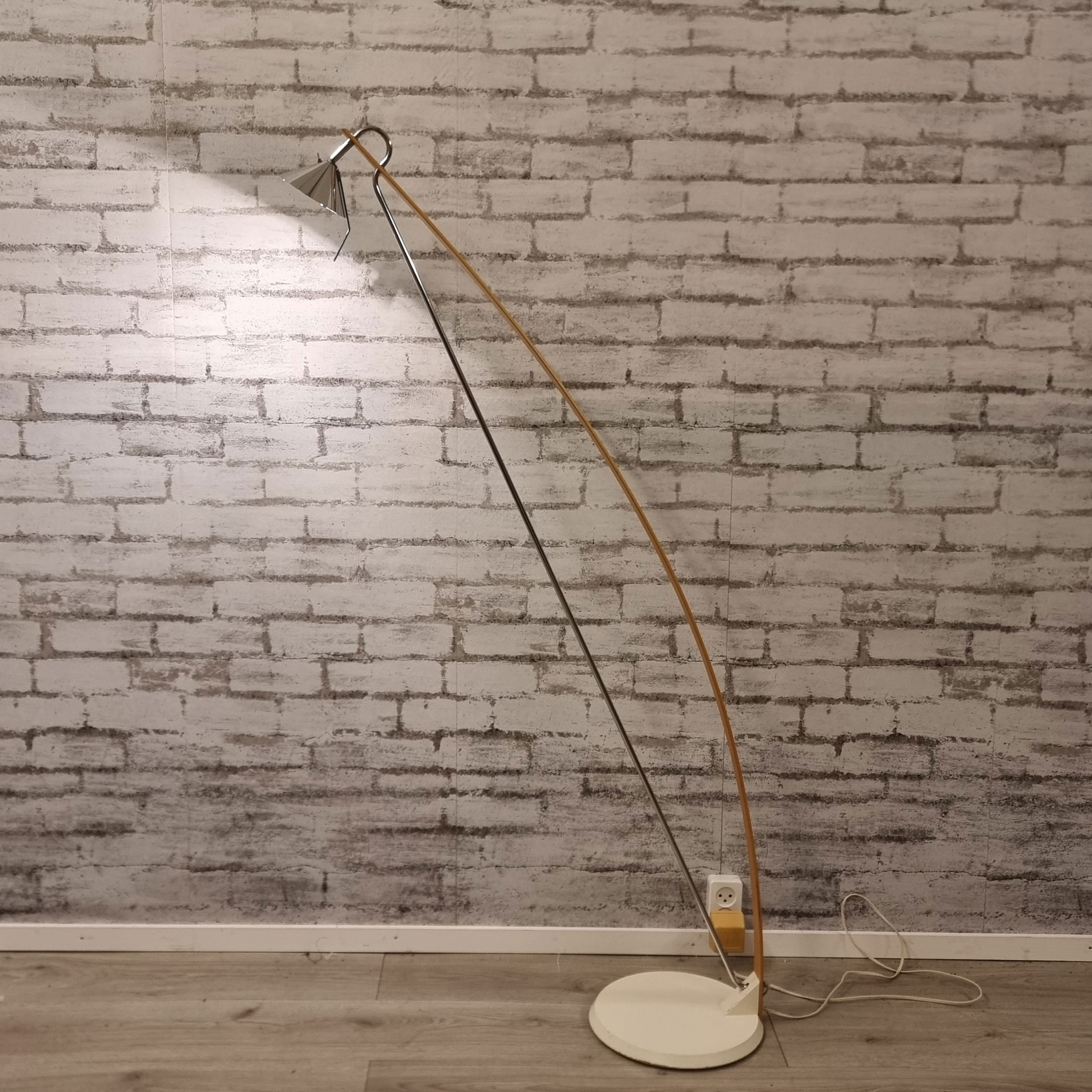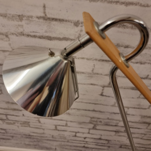 Een fraaie vloerlamp met een chroom stang en een houten spanboog. Voor zien van een halogeen lampje van 10 of 20 Watt.