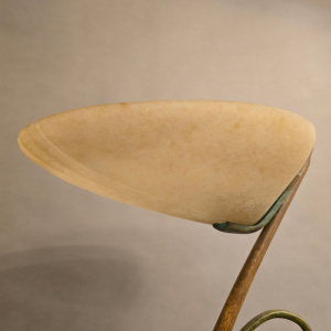 een klassieke topper. Prachtig vloerlamp met een getrokken buis statief, uitgevoerd in Brons Patiné, met oxide elementen en een origineel ovaal gevormd up light glas. Een juweeltje.