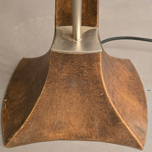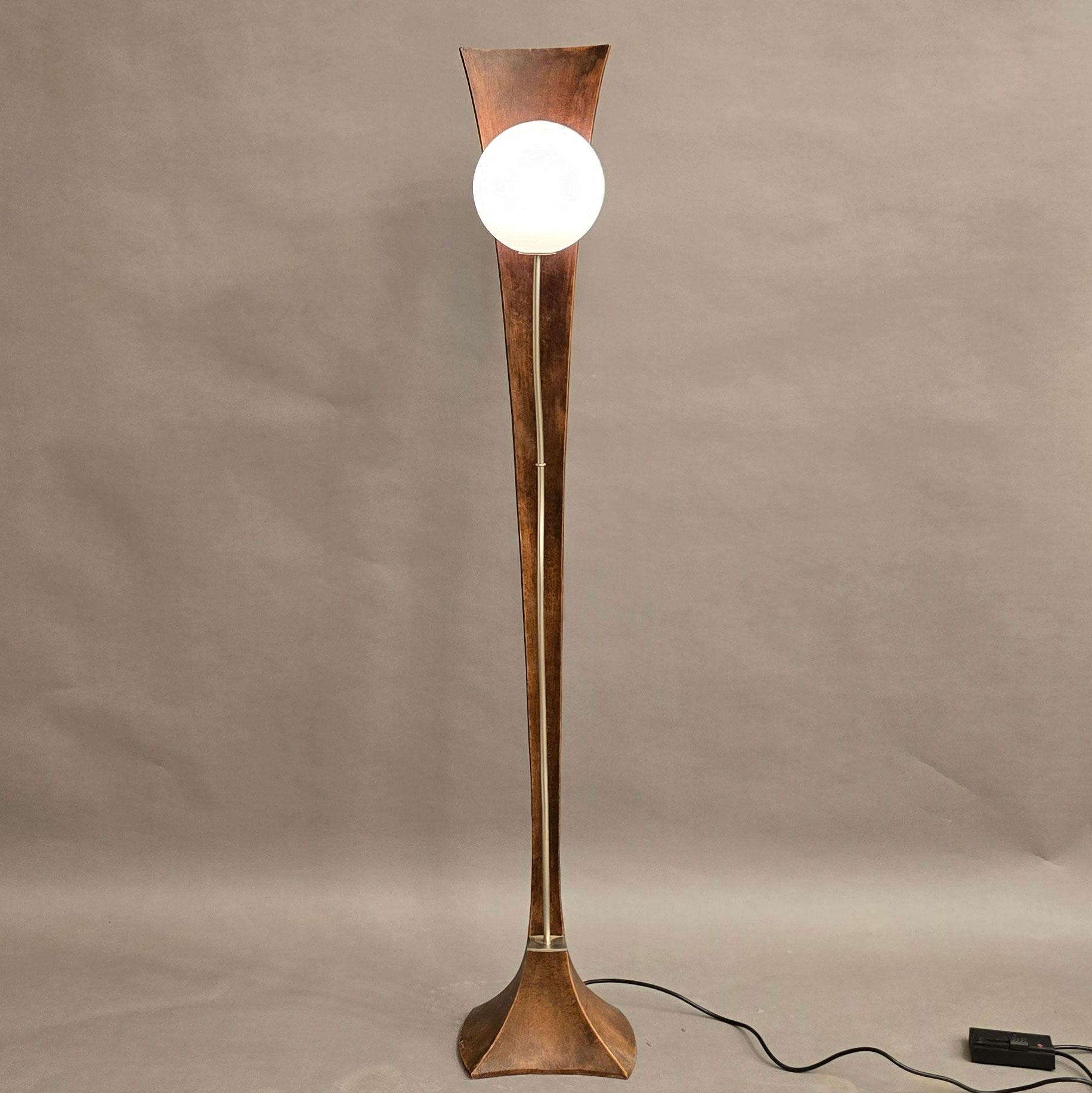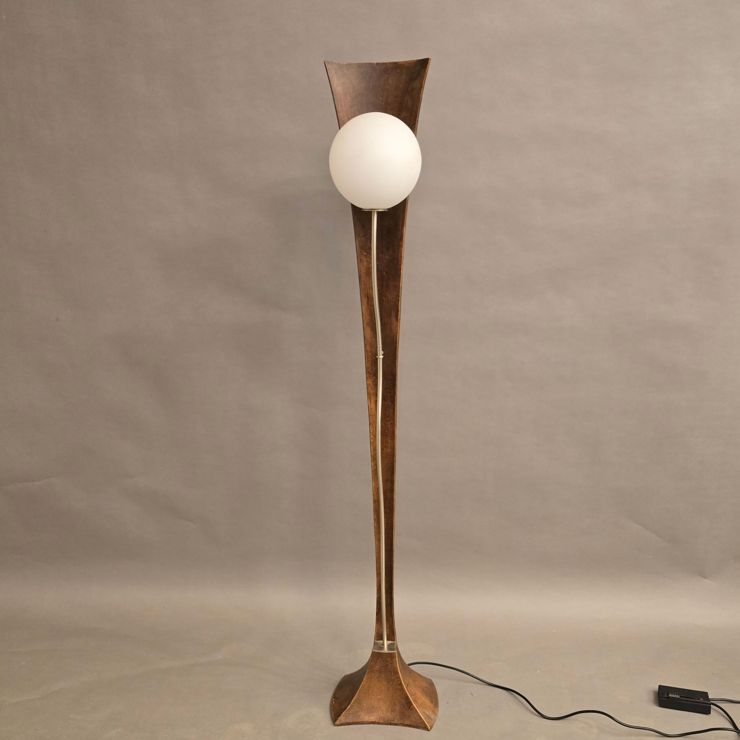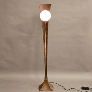 Een uniek statief, gegoten uit één stuk, uitgevoerd in brons patiné. De lampbuis in staal kleur, met witte glazen bol en voorzien van een halogeen lampje E14. Goed dimbaar met de snoerdimmer.