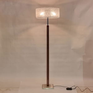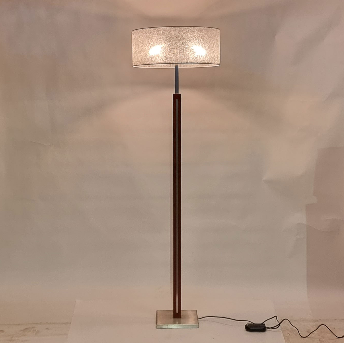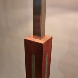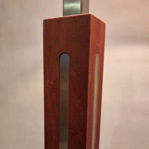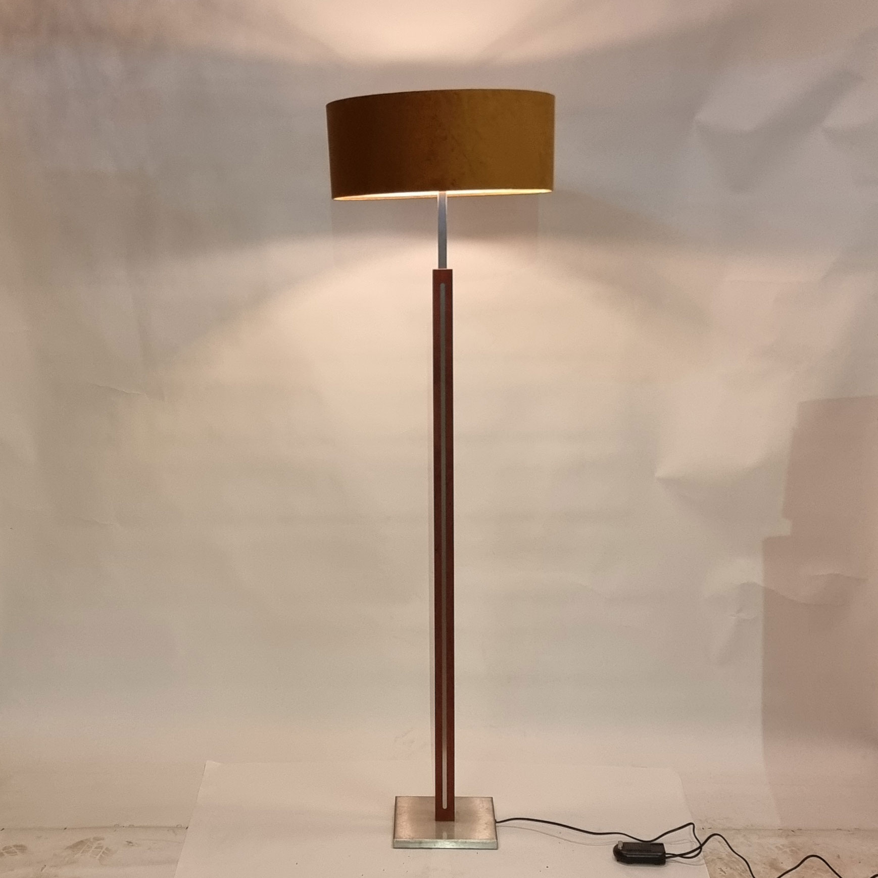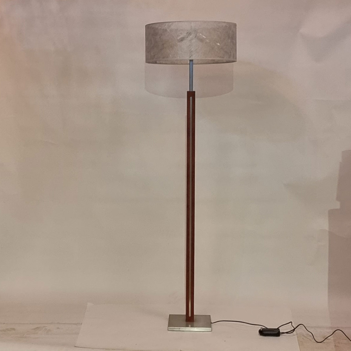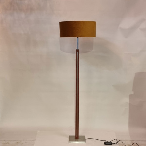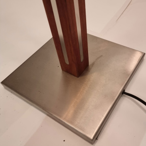 Fraai stijlvolle vloerlamp met vierkante voet en een vierkante stang RvS, ingelegd met kersen hout. Wordt geleverd met deze kap.
