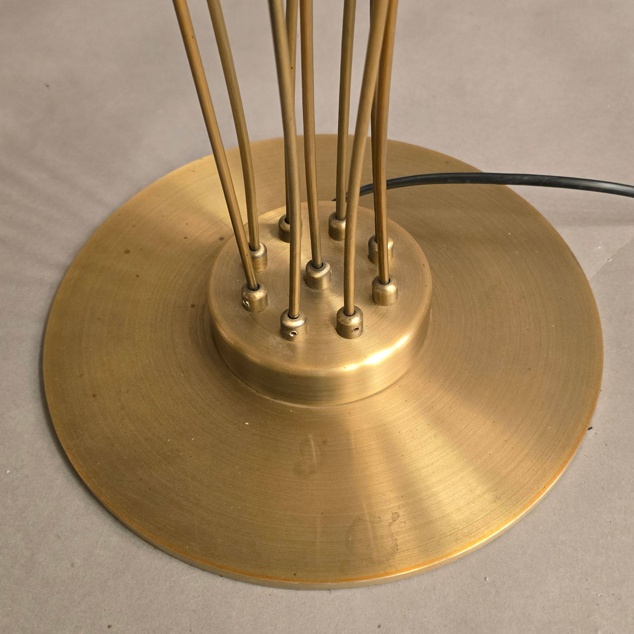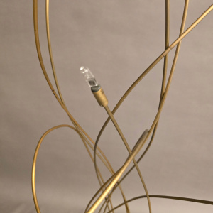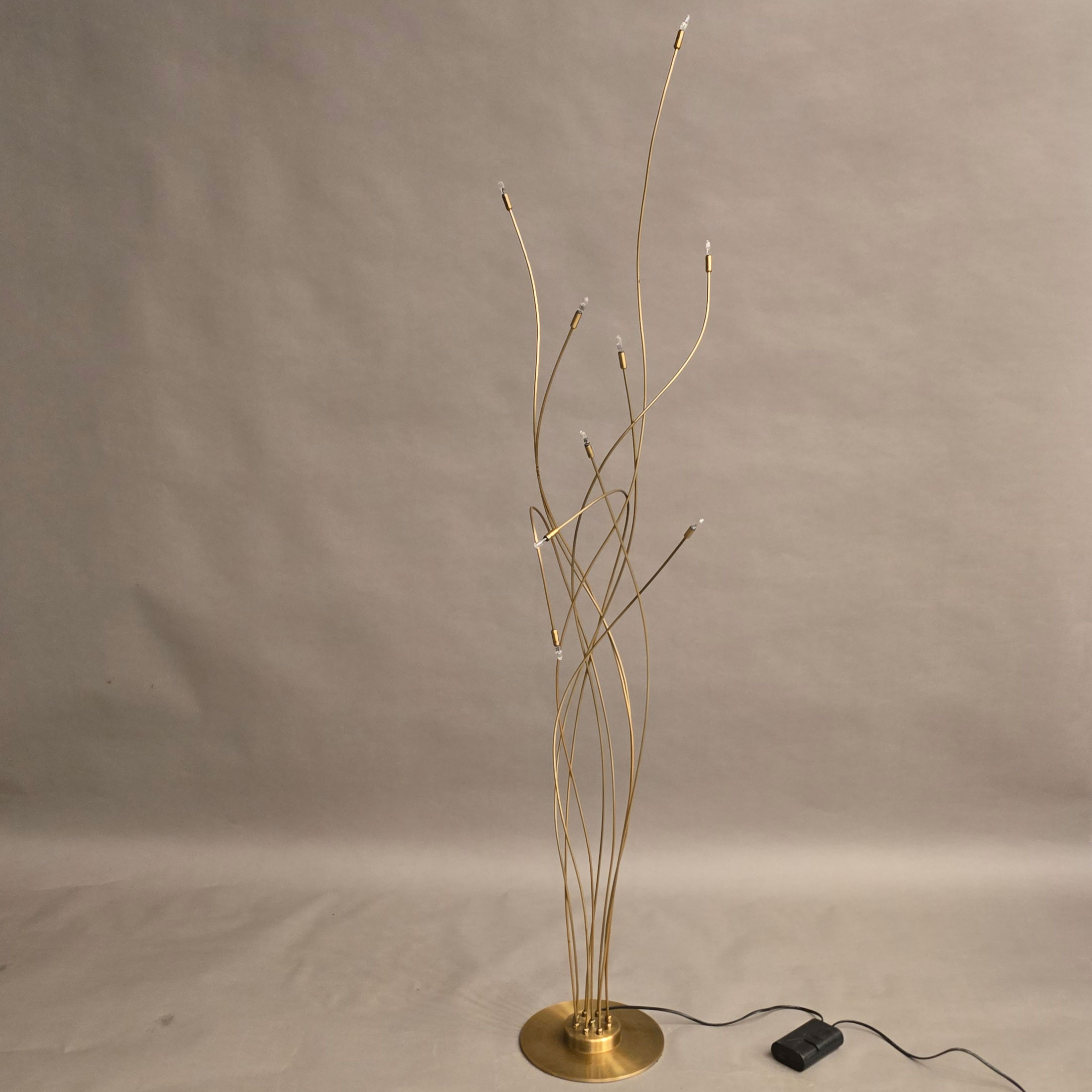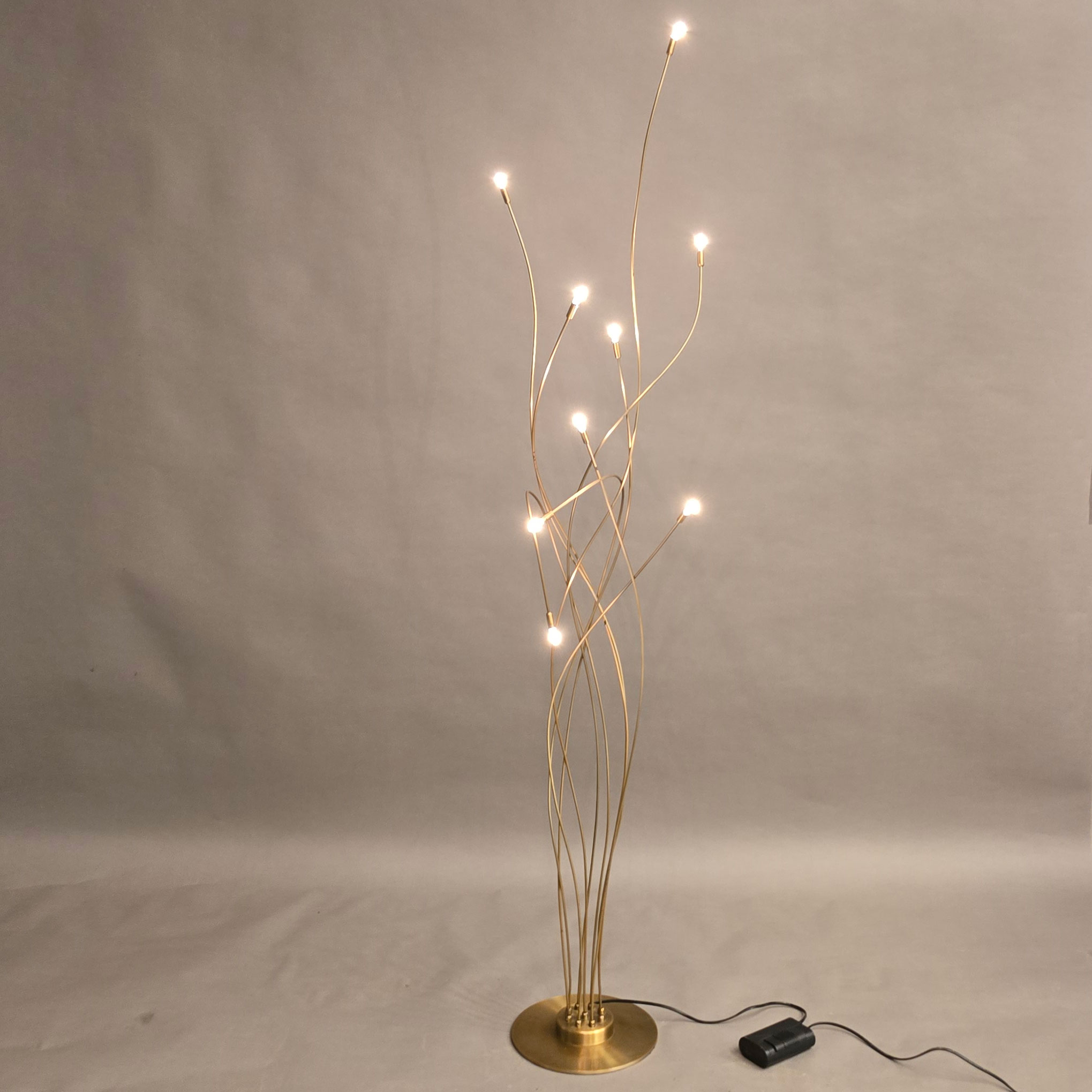 Een luxe bronzen vloer lamp met 9 armen en voorzien van 5 Watt halogeen lampjes, dimbaar met een snoertrafo. Uitgevoerd in 6 mm. armen, waardoor een slanke speelse uitstraling.