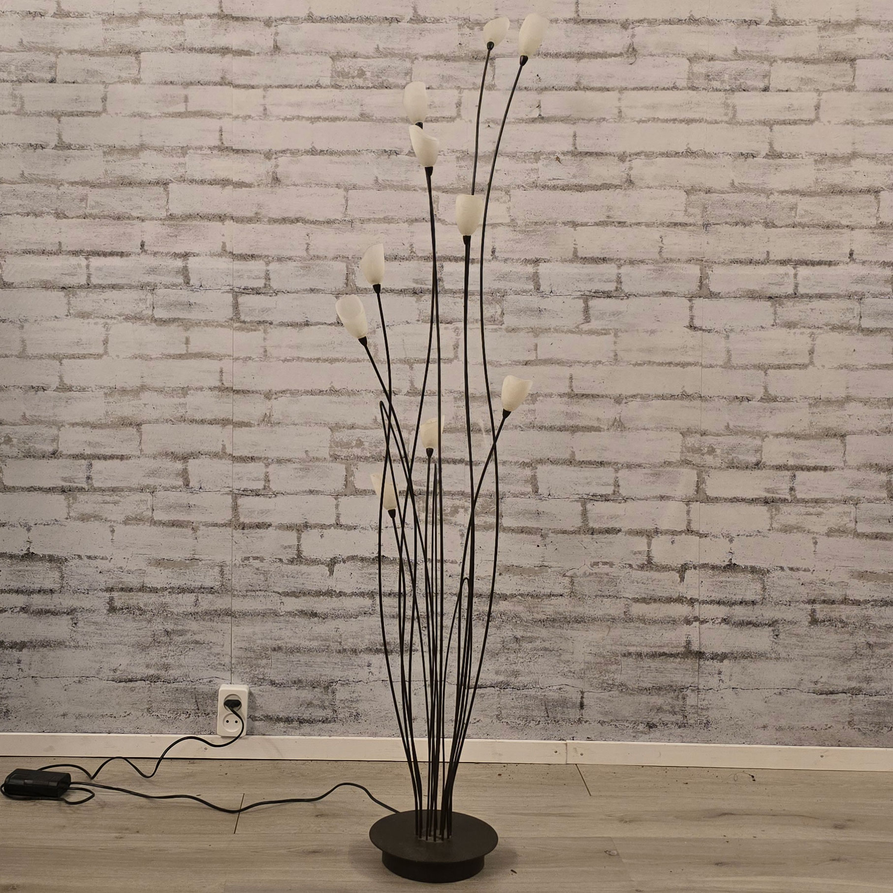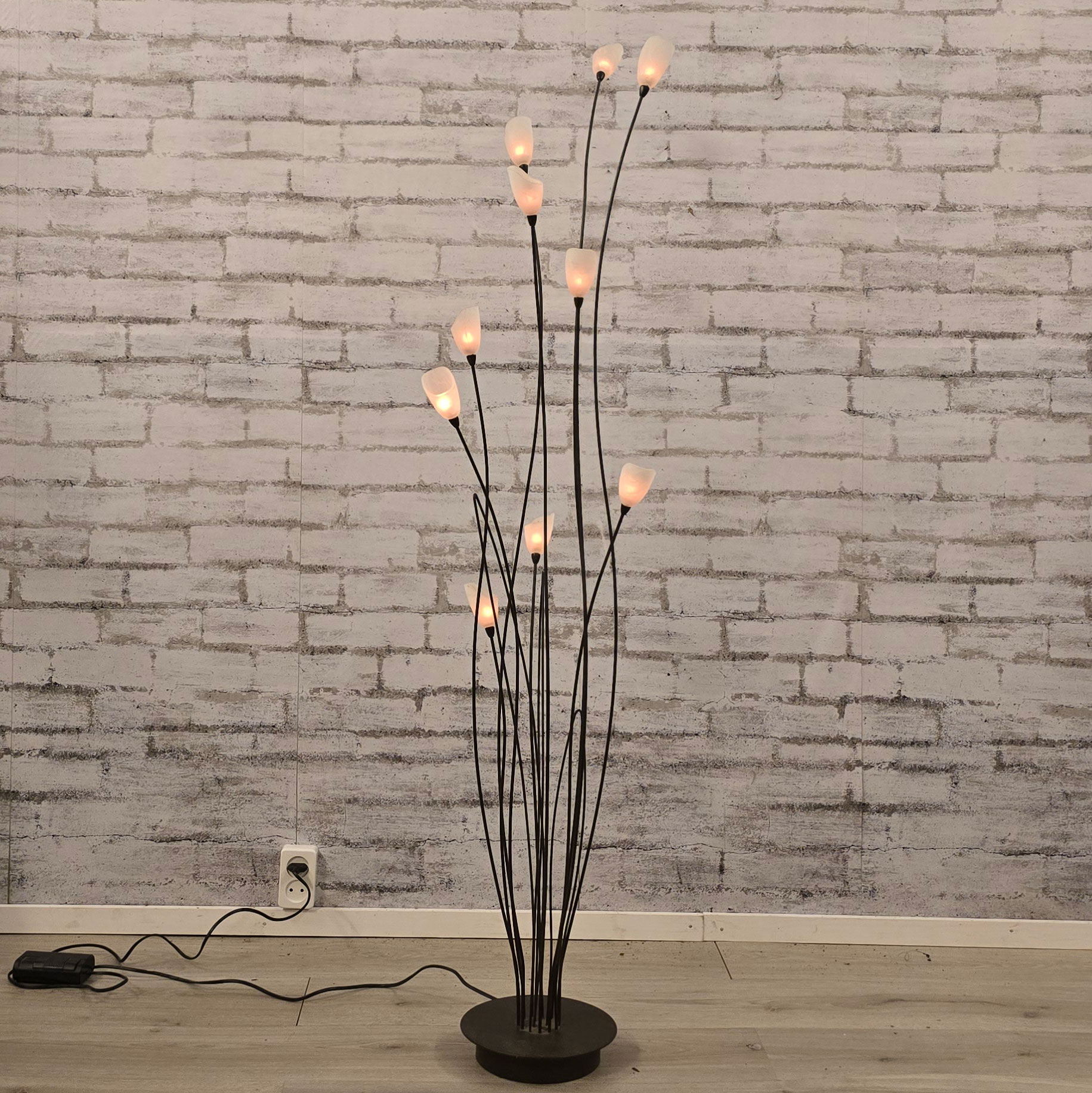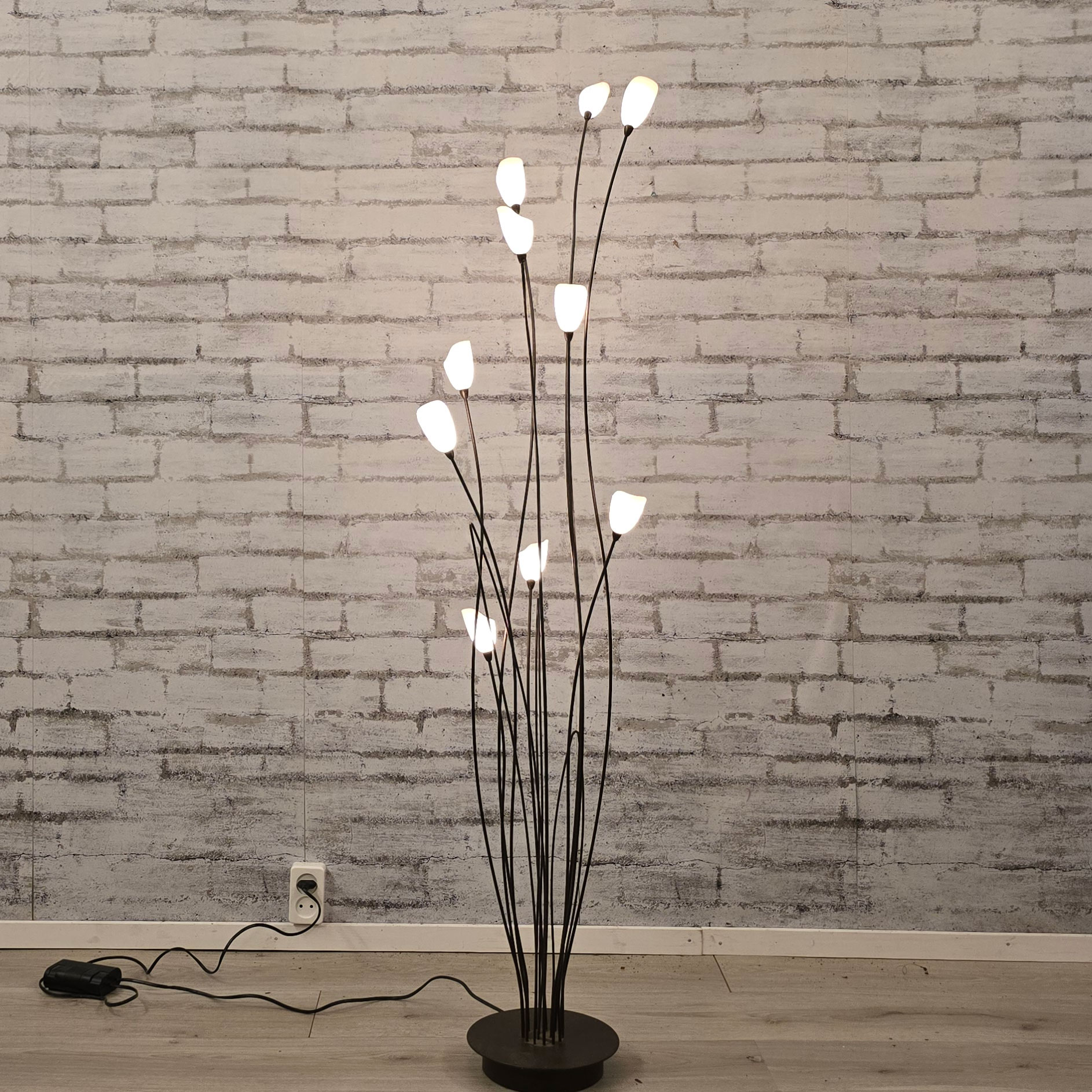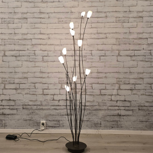Fraaie vloer lamp met 9 armen, witte glaasjes en voorzien van een vloerdimmer voor een passende lichtsterkte. Ander soort glaasjes behoord tot de mogelijkheden. Volop keus.